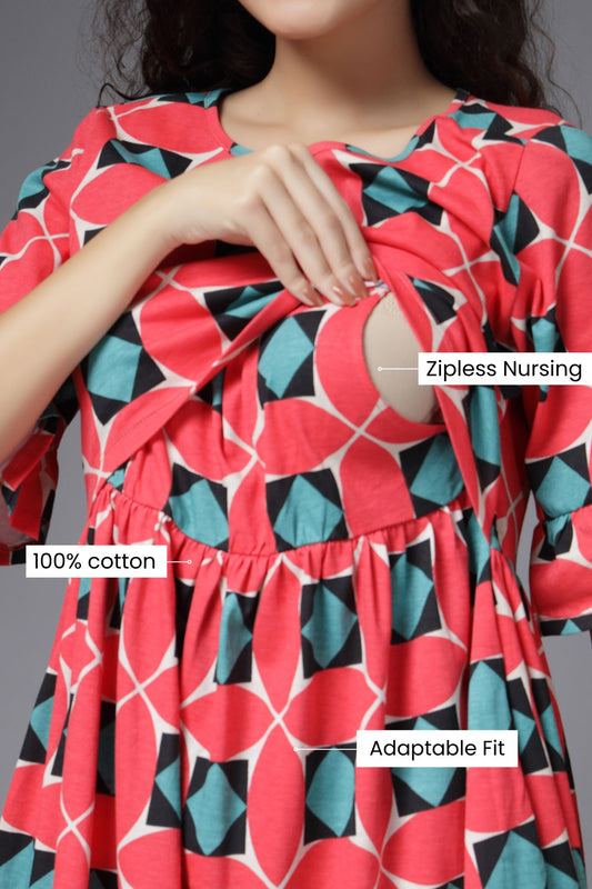 Red Floral Printed 100% Soft Cotton Zipless Maternity Top