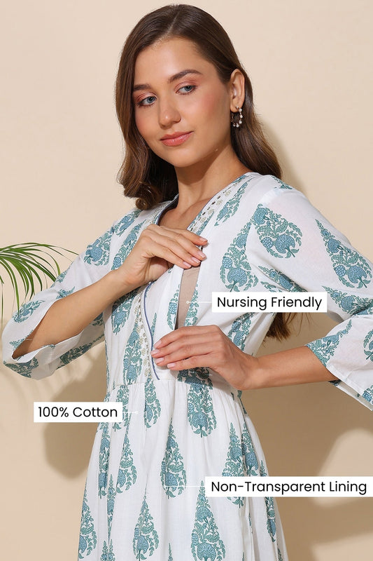 White Printed 100% Soft Cotton Maternity Feeding Dress