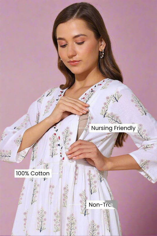 White Floral Printed 100% Soft Cotton Maternity Feeding Dress