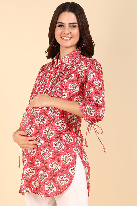 Pink & Maroon Gold Foil Print Zipless Feeding Kurta Pant Set